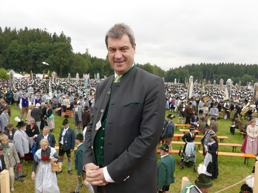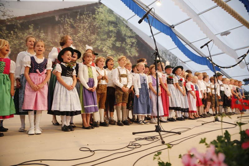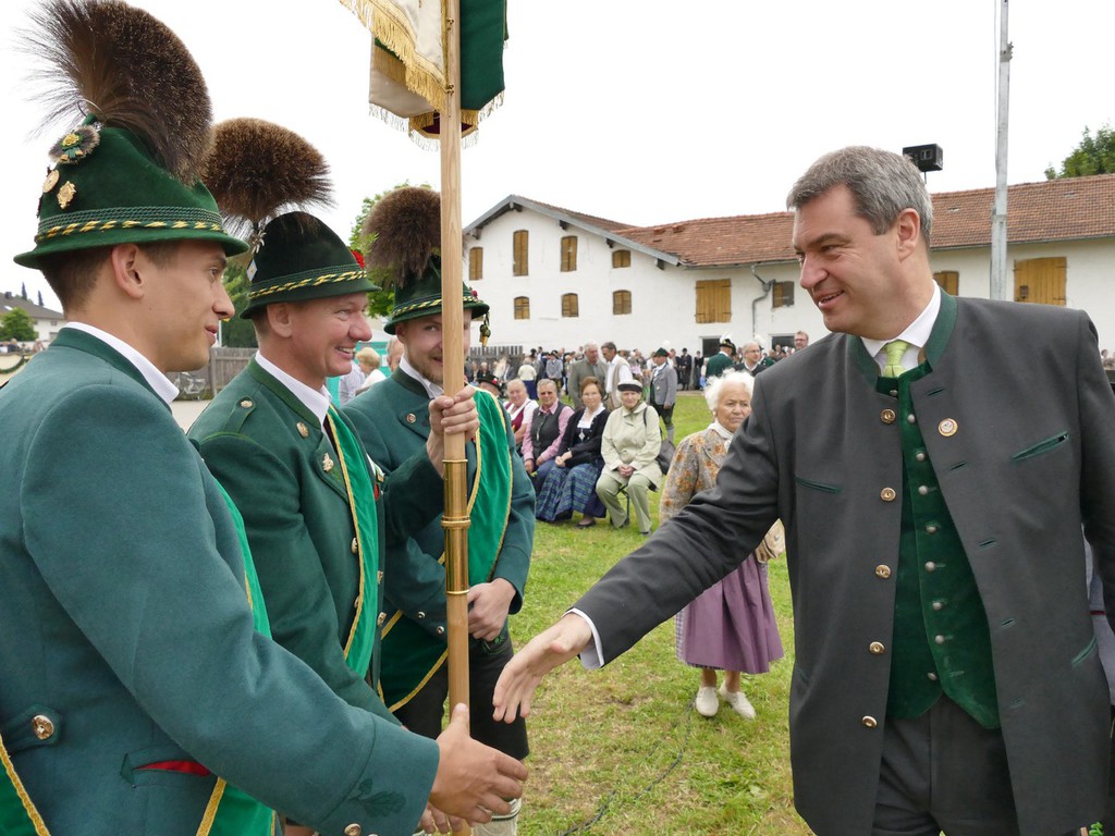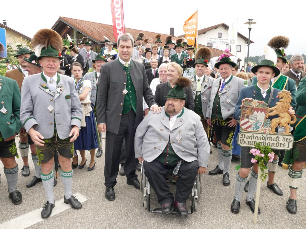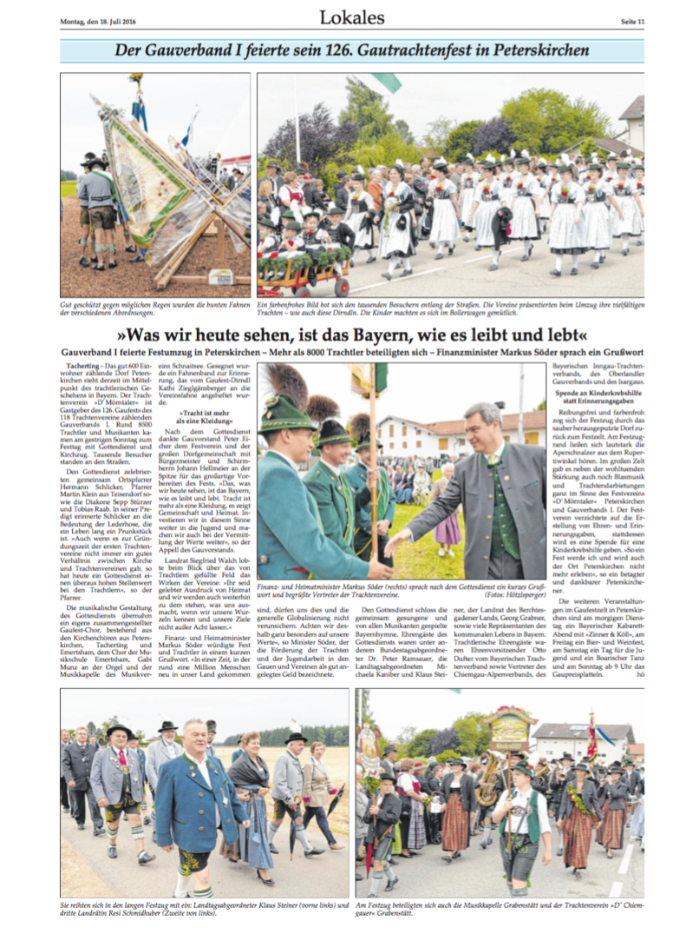 Den Gottesdienst zelebrierten gemeinsam Ortspfarrer Hermann Schlicker, Pfarrer Martin Klein aus Teisendorf (vormaliger Seelsorger in Peterskirchen) sowie die Diakone Sepp Stürzer und Tobias Raab. In seiner Predigt erinnerte Pfarrer Schlicker an die Bedeutung der Lederhose, die ein Leben lang ein Prunkstück ist. „Auch wenn es zur Gründungszeit der ersten Trachtenvereine nicht immer ein gutes Verhältnis zwischen Kirche und Trachtenvereinen gab, so hat heute ein Gottesdienst einen überaus hohen Stellenwert bei den Trachtlern“, so der Pfarrer. Die musikalische Gestaltung des Gottesdienstes übernahm ein eigens zusammengestellter Gaufest-Chor, bestehend aus den Kirchenchören Peterskirchen, Tacherting und Emertsham und unterstützt vom Chor der Musikschule Emertsham, von Gabi Munz an der Orgel und der Musikkapelle des Musikvereins Schnaitsee unter der Gesamtleitung von Rupert Schmidhuber. Gesegnet wurde ein Fahnenband zur Erinnerung, das vom Gaufest-Dirndl Kathi Zieglgänsberger an die Vereinsfahne angeheftet wurde. Nach dem Gottesdienst (mit kurzem Regenschauer) dankte Gauvorstand Peter Eicher dem Festverein und der großen Dorfgemeinschaft mit Bürgermeister und Schirmherrn Johann Hellmeier an der Spitze für das großartige Vorbereiten des Festes. „Das, was wir heute sehen, ist das Bayern wie es leibt und lebt. Tracht ist mehr als eine Kleidung, es zeigt Gemeinschaft und Heimat. Investieren wir in diesem Sinne weiter in die Jugend und machen wir auch bei der Vermittlung der Werte weiter“, so der Appell des Gauvorstandes. Auch Landrat Siegfried Walch vom Landkreis Traunstein lobte beim Blick über das von Trachtlern voll gefüllte Feld das Wirken der Vereine und er sagte: „Ihr seid gelebter Ausdruck von Heimat und wir werden auch weiterhin zu dem stehen, was uns ausmacht, wenn wir unsere Wurzeln kennen und unsere Ziele nicht außer acht lassen“. Markus Söder, Bayerischer Staatsminister für Finanzen, Landesentwicklung und Heimat würdigte Fest und Trachtler in einem kurzen Grußwort. „In einer Zeit, in der rund eine Million Menschen neu in unser Land gekommen sind dürfen uns dies und die generelle Globalisierung nicht verunsichern, achten wir deshalb ganz besonders auf unsere Werte“, so Minister Söder, der die Förderung der Trachten und der Jugendarbeit in den Gauen und Vereinen als gut angelegtes Geld bezeichnete. Den Gottesdienst beschloss die gemeinsam gesungene und von allen Musikanten gespielte Bayernhymne. Ehrengäste des Gottesdienstes waren unter anderem Bundestagsabgeordneter Dr. Peter Ramsauer, die Landtagsabgeordneten Michaela Kaniber und Klaus Steiner, Landrat Georg Grabner vom Landkreis Berchtesgadener Land sowie viele Repräsentanten des kommunalen Lebens in Bayern. Trachtlerische Ehrengäste waren Ehrenvorsitzender Otto Dufter vom Bayerischen Trachtenverband sowie Vertreter des Chiemgau-Alpenverbandes, des Bayerischen Inngau-Trachtenverbandes, des Oberlandler Gauverbandes und des Isargaues. Reibungsfrei und farbenfroh zog sich der Festzug in zwei über 30 Zügen und in zwei Abschnitten durch das sauber heraugeputzte Dorf zurück zum Festzelt. Am Festzugrand ließen sich lautstark die Aperschnalzer aus dem Rupertiwinkl hören. Im riesig großen Zelt gab es neben der wohltuenden Stärkung auch noch Blasmusik und Trachtendarbietungen ganz im Sinne des Festvereins „D´Mörntaler“ Peterskirchen und Gauverbandes I. Der Festverein verzichtete auf die Erstellung von Ehren- und Erinnerungsgaben, anstatt dessen wird es eine Spende für eine Kinderkrebshilfe geben. „So ein Fest werde ich und wird auch der Ort Peterskirchen nicht mehr erleben“, so ein betagter und dankbarer Peterskirchener.