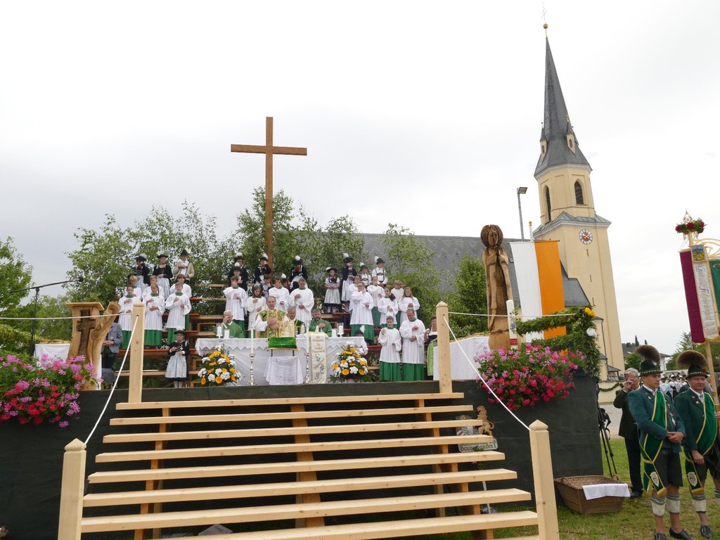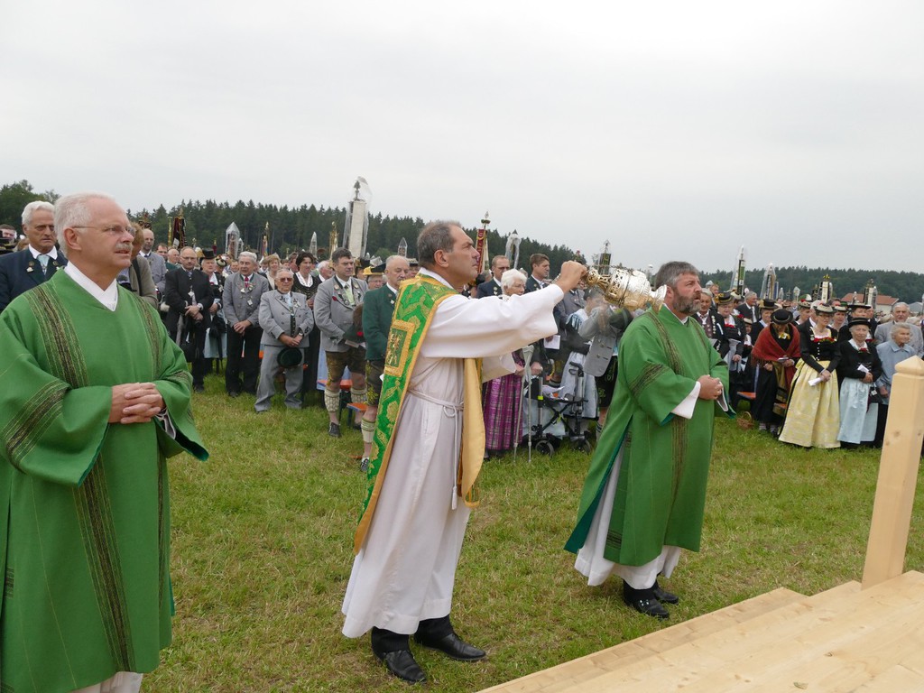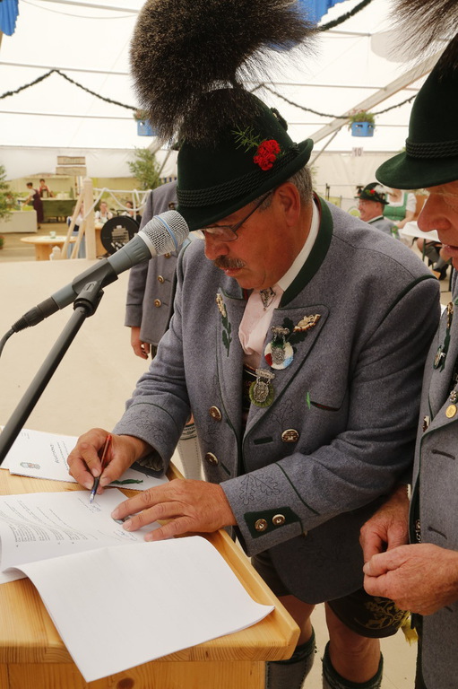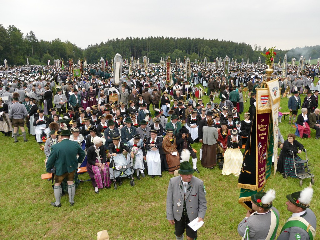 Den Gottesdienst zelebrierten gemeinsam Ortspfarrer Hermann Schlicker, Pfarrer Martin Klein aus Teisendorf (vormaliger Seelsorger in Peterskirchen) sowie die Diakone Sepp Stürzer und Tobias Raab. In seiner Predigt erinnerte Pfarrer Schlicker an die Bedeutung der Lederhose, die ein Leben lang ein Prunkstück ist. „Auch wenn es zur Gründungszeit der ersten Trachtenvereine nicht immer ein gutes Verhältnis zwischen Kirche und Trachtenvereinen gab, so hat heute ein Gottesdienst einen überaus hohen Stellenwert bei den Trachtlern“, so der Pfarrer. Die musikalische Gestaltung des Gottesdienstes übernahm ein eigens zusammengestellter Gaufest-Chor, bestehend aus den Kirchenchören Peterskirchen, Tacherting und Emertsham und unterstützt vom Chor der Musikschule Emertsham, von Gabi Munz an der Orgel und der Musikkapelle des Musikvereins Schnaitsee unter der Gesamtleitung von Rupert Schmidhuber. Gesegnet wurde ein Fahnenband zur Erinnerung, das vom Gaufest-Dirndl Kathi Zieglgänsberger an die Vereinsfahne angeheftet wurde. Nach dem Gottesdienst (mit kurzem Regenschauer) dankte Gauvorstand Peter Eicher dem Festverein und der großen Dorfgemeinschaft mit Bürgermeister und Schirmherrn Johann Hellmeier an der Spitze für das großartige Vorbereiten des Festes. „Das, was wir heute sehen, ist das Bayern wie es leibt und lebt. Tracht ist mehr als eine Kleidung, es zeigt Gemeinschaft und Heimat. Investieren wir in diesem Sinne weiter in die Jugend und machen wir auch bei der Vermittlung der Werte weiter“, so der Appell des Gauvorstandes. Auch Landrat Siegfried Walch vom Landkreis Traunstein lobte beim Blick über das von Trachtlern voll gefüllte Feld das Wirken der Vereine und er sagte: „Ihr seid gelebter Ausdruck von Heimat und wir werden auch weiterhin zu dem stehen, was uns ausmacht, wenn wir unsere Wurzeln kennen und unsere Ziele nicht außer acht lassen“. Markus Söder, Bayerischer Staatsminister für Finanzen, Landesentwicklung und Heimat würdigte Fest und Trachtler in einem kurzen Grußwort. „In einer Zeit, in der rund eine Million Menschen neu in unser Land gekommen sind dürfen uns dies und die generelle Globalisierung nicht verunsichern, achten wir deshalb ganz besonders auf unsere Werte“, so Minister Söder, der die Förderung der Trachten und der Jugendarbeit in den Gauen und Vereinen als gut angelegtes Geld bezeichnete. Den Gottesdienst beschloss die gemeinsam gesungene und von allen Musikanten gespielte Bayernhymne. Ehrengäste des Gottesdienstes waren unter anderem Bundestagsabgeordneter Dr. Peter Ramsauer, die Landtagsabgeordneten Michaela Kaniber und Klaus Steiner, Landrat Georg Grabner vom Landkreis Berchtesgadener Land sowie viele Repräsentanten des kommunalen Lebens in Bayern. Trachtlerische Ehrengäste waren Ehrenvorsitzender Otto Dufter vom Bayerischen Trachtenverband sowie Vertreter des Chiemgau-Alpenverbandes, des Bayerischen Inngau-Trachtenverbandes, des Oberlandler Gauverbandes und des Isargaues. Reibungsfrei und farbenfroh zog sich der Festzug in zwei über 30 Zügen und in zwei Abschnitten durch das sauber heraugeputzte Dorf zurück zum Festzelt. Am Festzugrand ließen sich lautstark die Aperschnalzer aus dem Rupertiwinkl hören. Im riesig großen Zelt gab es neben der wohltuenden Stärkung auch noch Blasmusik und Trachtendarbietungen ganz im Sinne des Festvereins „D´Mörntaler“ Peterskirchen und Gauverbandes I. Der Festverein verzichtete auf die Erstellung von Ehren- und Erinnerungsgaben, anstatt dessen wird es eine Spende für eine Kinderkrebshilfe geben. „So ein Fest werde ich und wird auch der Ort Peterskirchen nicht mehr erleben“, so ein betagter und dankbarer Peterskirchener.