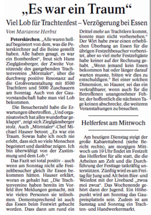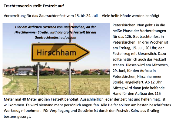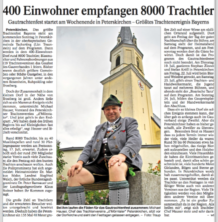 Peterskirchen. Die Mitglieder des Trachtenverein D’Mörntaler Peterskirchen fahren am Sonntag, 16. Juli, zum 127. Gautrachtenfest nach Bad Feilnbach. Treffpunkt zur gemeinsamen Abfahrt mit dem Bus ist um 6.45 Uhr am Vereinsheim, die Abfahrt ist pünktlich um 7 Uhr. Die Aufstellung beim Gaufest zum Kirchenzug ist um 9 Uhr, der Festgottesdienst mit anschließendem Festzug beginnt um 10 Uhr. Der Verein aus Peterskirchen marschiert in Marschblock 2, Zug 38. Die Sitzplätze sind im Hauptzelt, Eingang 1 B, links vor der Kaffee und Kuchentheke. Bereits am Samstag, 15. Juli, wird am Gauheimatabend teilgenommen. Gemeinsame Abfahrt mit Privatautos und Mitfahrgelegenheiten, ist um 18 Uhr vor dem Trachtenheim. Der Verein hofft bei beiden Terminen als letzter Gaufestausrichter auf große Unterstützung.