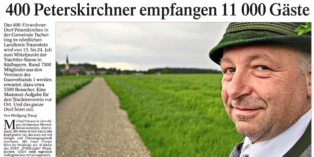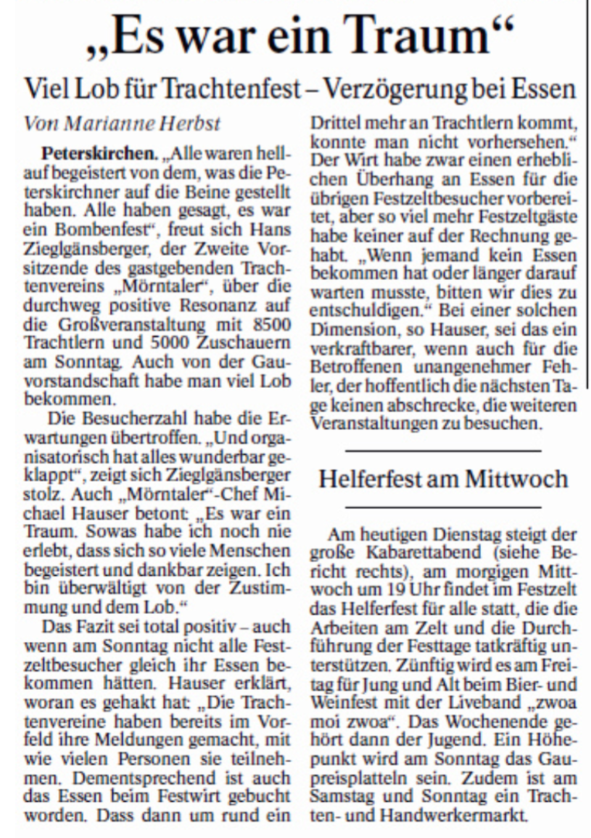 Peterskirchen (hö) – Das gut 600 Einwohner zählende Dorf Peterskirchen in der Gemeinde Tacherting steht derzeit im Mittelpunkt des trachtlerischen Geschehens in Bayern. Der dortige Trachtenverein D´Mörntaler ist heuriger Gastgeber vom bislang 126. Gautrachtenfest des 118 Trachtenvereine zählenden Gauverbandes I. 8.500 Trachtlerinnen, Trachtler sowie Musikantinnen und Musikanten prägten den Festhöhepunkt auf Gaufestsonntag und das Dorfgeschehen. Zahlreiche Zuschauer waren bereits beim Gottesdienst am festlichen Kirchplatz nahe der Ortskirche zugegen als Vorstand Michael Hauser mit einem herzlichen „Grüaß Gott“ die Trachtlerschar und viele Ehrengäste willkommen hieß.